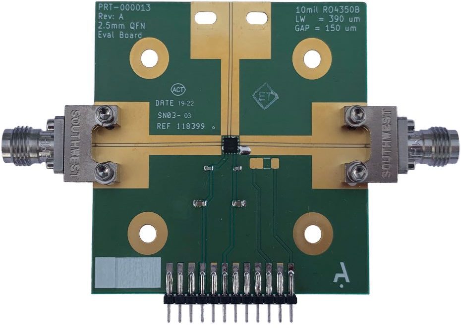 ARF1205Q2 is a 13—25 GHz low noise amplifier / driver amplifier designed for high data-rate applications. With 23 dB of linear gain, 2.5 dB noise figure. The circuit draws 50 mA from a 3.3 V DC supply. The part is internally matched to 50 Ω with ESD protection. RF ports are DC grounded. A VBIAS pin can be connected to the 3.3 V supply, or connected to ground to power down the device.