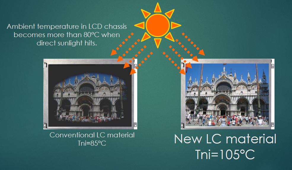 Our partner LCD World now offers big TFTs with high temperature range. They use an new special cyrstal.This special material later changes the physical state and therefore better for high temperatures.