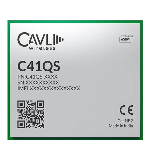 C41QS is Cavli’s entrant in the all-new NarrowBand-Internet of Things (NB-IoT) platform, based on low power wide area networks (LPWAN) technology. The C41QS is a NB2/NB1 Module compatible with 3GPP E-UTRA Release 14 standards supporting a wide array of frequency bands, making it usable globally while providing leverageable low-power consumption. The module is designed in a compact form factor of 17.7mm x 15.8mm x 2.0mm, making it an ideal solution for applications where size is constrained. The module supports an optional integrated GNSS and integrated eSIM, enabling Global Connectivity and Device management features powered by Cavli’s proprietary Hubble platform..