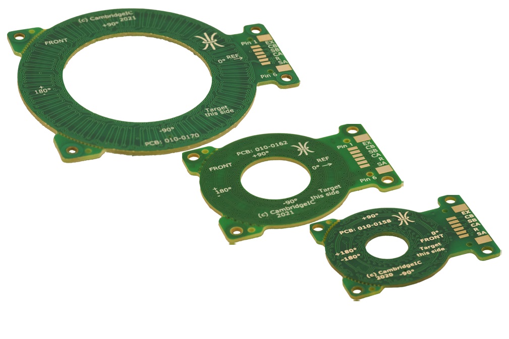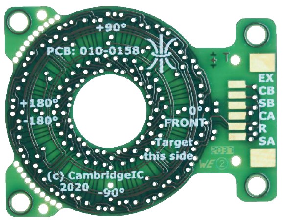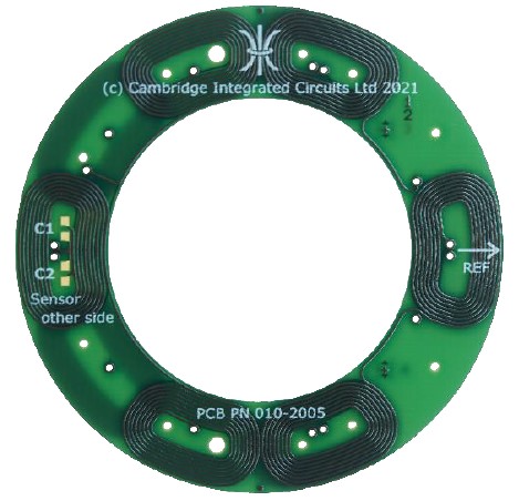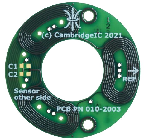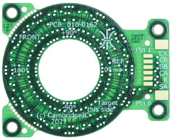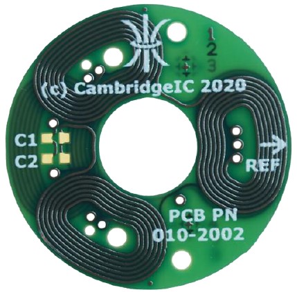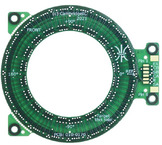 Resonant inductive position sensors and targets for measuring full absolute angle across 360°. The sensor connects to a Resonant Inductive Encoder IC such as the CAM622 to provide high-quality position and velocity data to a host device. The sensor design includes two pairs of PCB coils for detecting the target. Fine coils provide high accuracy and resolution and repeat 3 times around 360°. Coarse coils repeat once around 360° for full absolute measurement of angle. The matching non-contact target design includes a PCB printed resonator coil and SMD capacitor(s). These form a resonant circuit, owered without electrical contact by the sensor’s excitation coil. The resonator coil design is patterned to minimise the effect of misalignments on reported angle. The sensor and target are Type “B3” or “B5”. “B” refers to the resonator frequency band centred on 833kHz. “3” or “5” are the numbers of fine sensor coil periods per coarse.