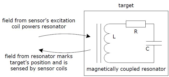 The target includes an inductively coupled resonant circuit comprising a ferrite rod wound with a coil connected to a capacitor. The circuit’s resonant frequency matches the operating frequency of the CTU. The high Q-factor of the resonator enables high resolution position sensing.