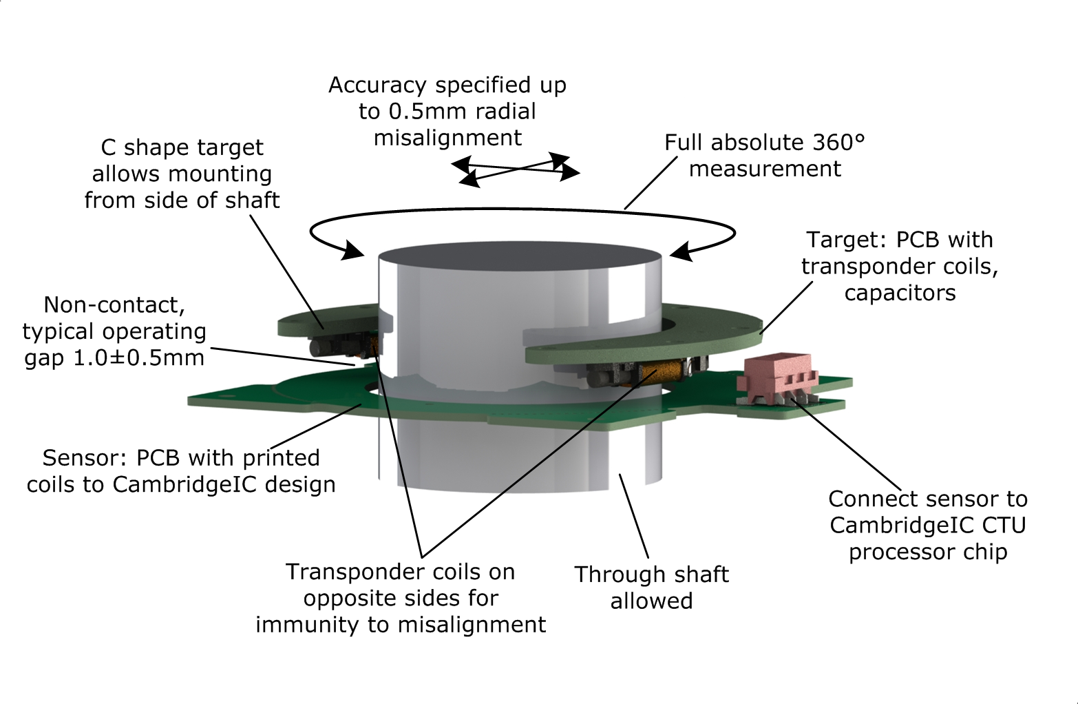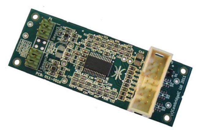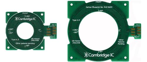 CambridgeIC’s CAM204 inductive processor IC connects to two Type 6 Through-Hole Rotary Sensors and measures the angle of their matching targets without contact.