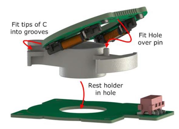 The Type 6 Rotary Development Kit includes a set of parts for product evaluation. It connects to a PC over a USB interface, so that angle measurements can be displayed on-screen using CambridgeIC CTU Software.