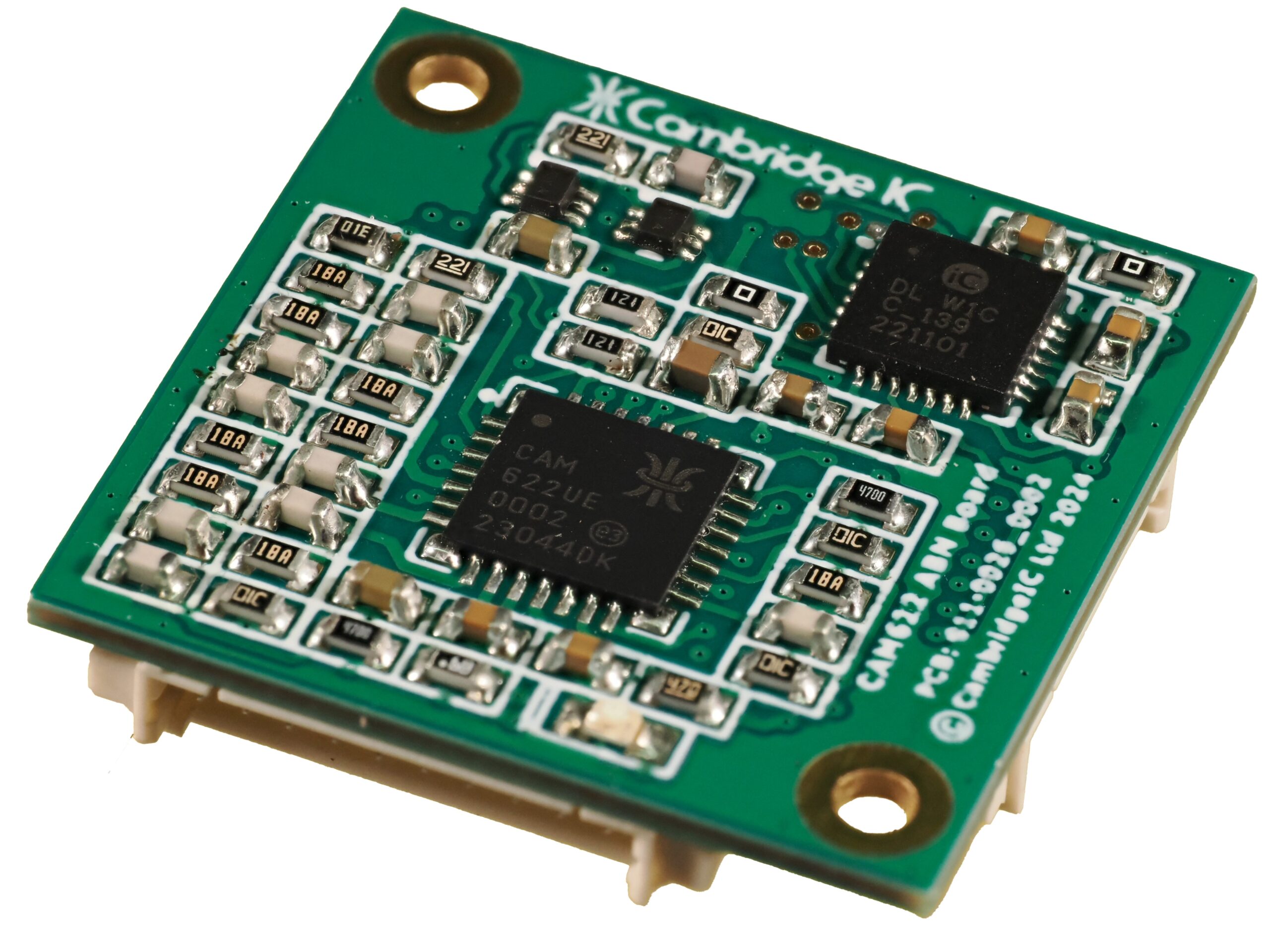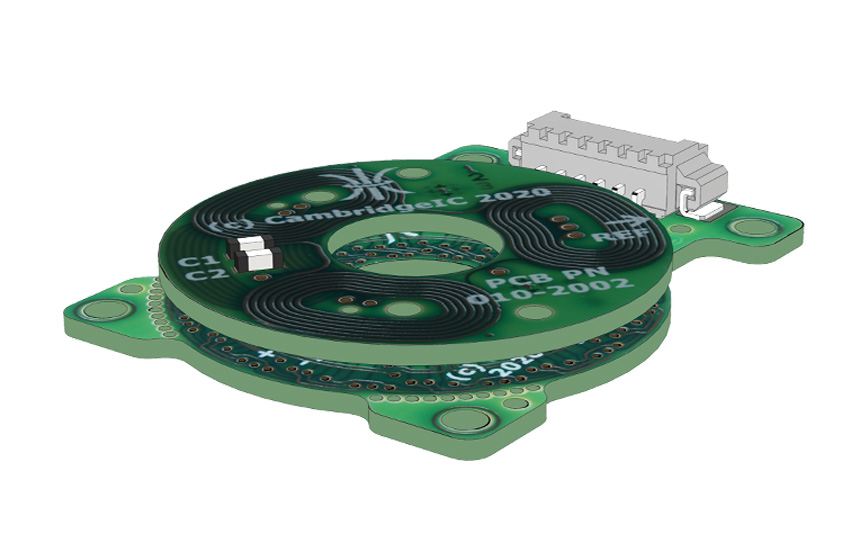 The CAM622 ABN Board generates encoder-like ABN digital quadrature signals in response to movement of a contactless target. It connects to a Type B resonant inductive sensor designed by CambridgeIC. The sensor and target are both conventional PCBs. Processing is done by CambridgeIC’s CAM622 resonant inductive encoder IC. The CAM622 energises the sensor, detects signals induced in sensor coils by the target, and processes them to determine position every 30μs. The CAM622 includes a synthesizer to generate realtime ABN signals which precisely follow target movement. A switching power supply efficiently regulates 5V power to 3.3V for the CAM622. A line driver generates differential ABN outputs. Please refer to the CAM622 datasheet for features and specifications of the CAM622, and to the appropriate sensor datasheet for sensor details and performance. A Streaming Adapter is available to connect he CAM622 ABN Board to a PC over USB. CAM622 Configuration Tool PC software is available for configuring and viewing measurement results.