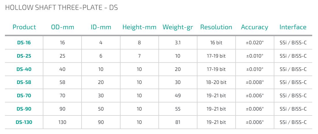 | DS-16 | 16 | 4 | 8 | 3,1 | 16 | ± 0,020° | SSi / BiSS-C |