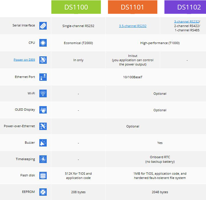 The DS1101 and DS1102 devices are powerful and versatile. Available options include the Wi-Fi interface, OLED display, power-over-Ethernet, and a choice of serial port configurations.