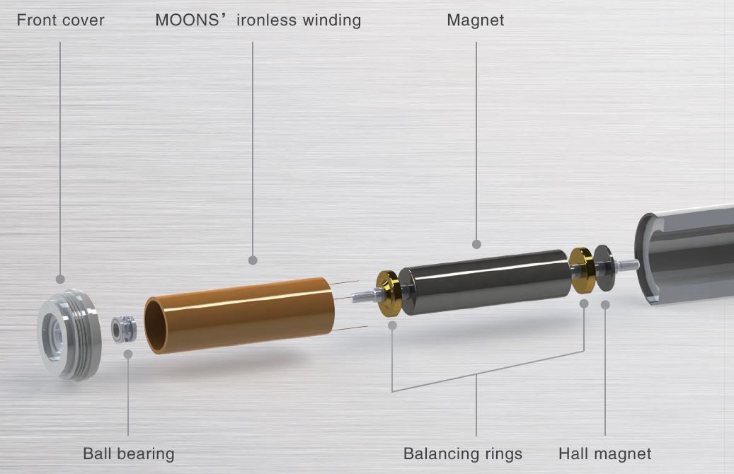 MOONS’ high performance slotless BLDC motor use independent patented ironless winding, this special design can bring high speed, high torque and low noise. Because of no cogging and compact structure, we can get smoother running at high or low speed, more accurate control, higher efficiency and higher power density.