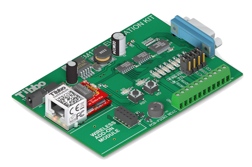 The EM1206EV Evaluation Board offers a convenient way to test the EM1206 Tibbo BASIC/C-programmable Ethernet module.