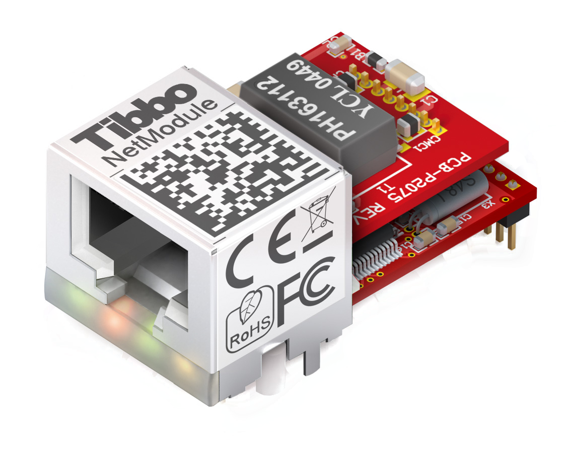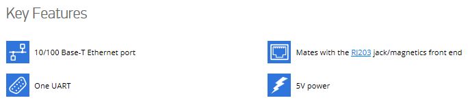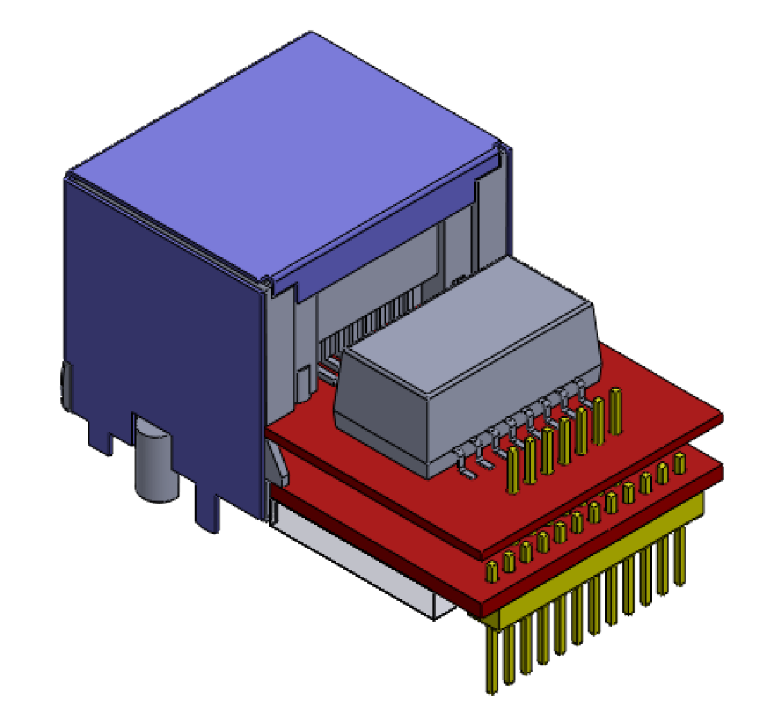 In combination with the RJ203 jack/magnetics front end (shown), the EM203 forms a complete Ethernet node occupying only 31x20mm (1.22×0.79″) of the host board’s space.