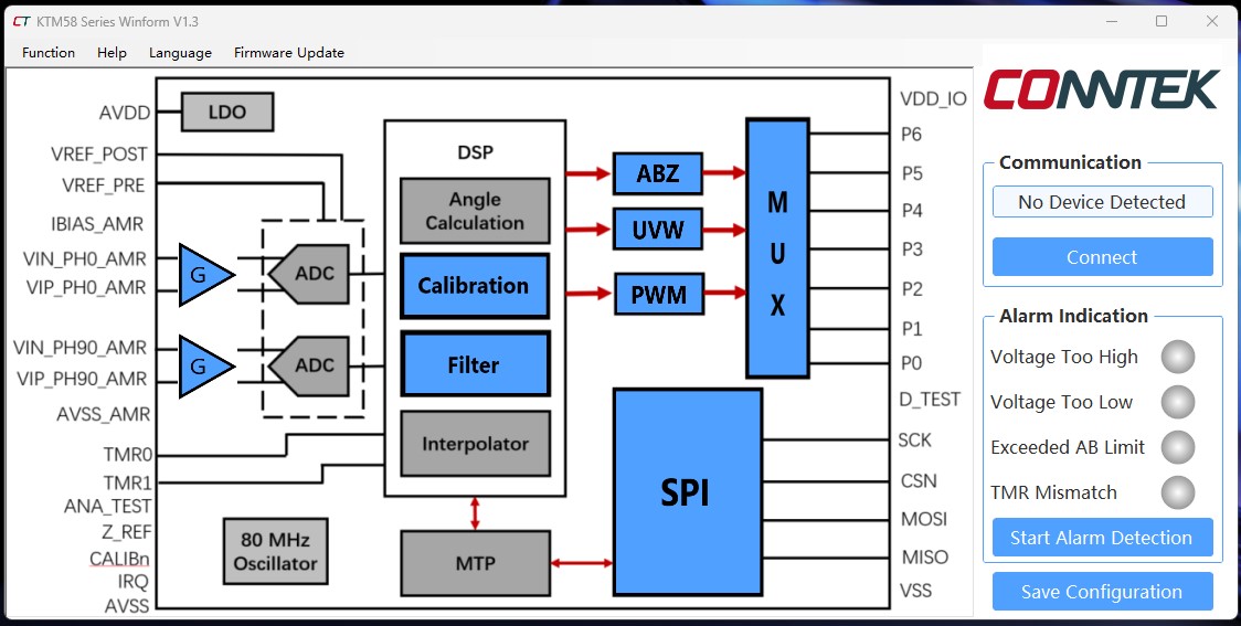 The EVM5900 contains all parts that are needed to evaluate the 24-bit Magnetic TMR Encoder IC KTM5900.