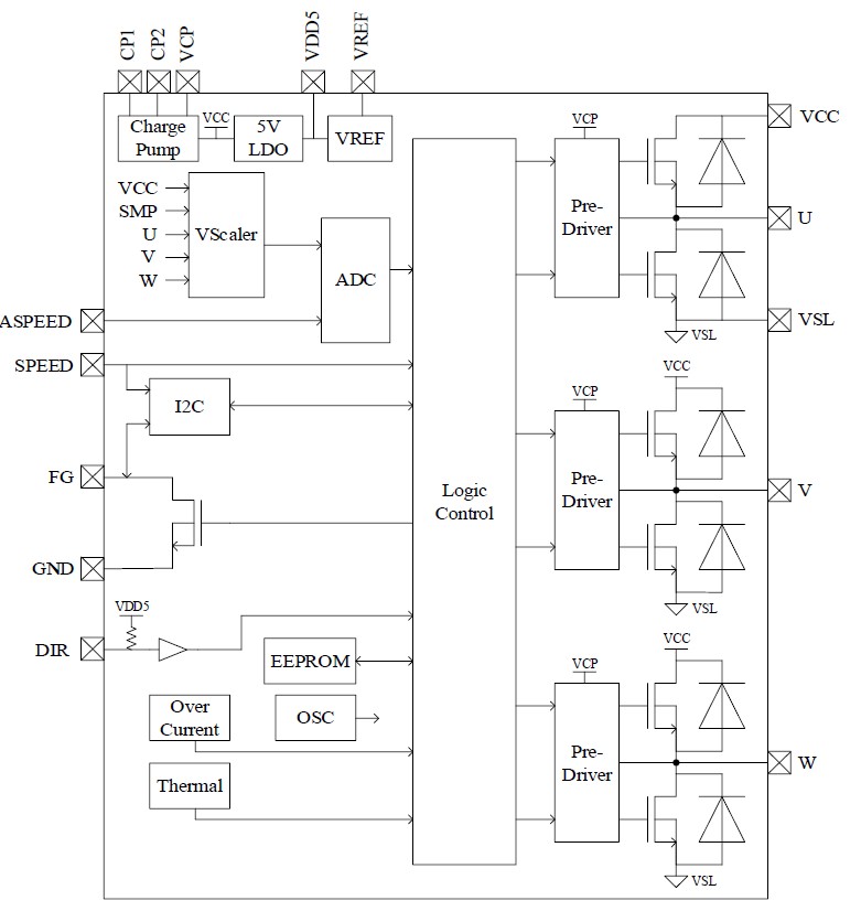 Due to a high level of integration, few peripheral components are required. The chip features with low noise and small torque ripple. Motor parameters, startup control parameters and speed regulation mode can be configured via GUI, and are stored in built-in EEPROM. Analog voltage, PWM, I2C interface or CLOCK mode is optional for motor speed regulation. Moreover, the chip integrates speed indicator, which reads motor speed in real time via FG pin or I2C interface. Speed control mode, current-loop control mode or voltage-loop control mode is optional. In addition, the chip is secured with a wide range of protection features, including over-current protection (OCP), under-voltage lockout (UVLO), temperature sensor detect (TSD), motor lock protection (MLP) and phase loss protection. Sleep current of the chip is about 40μA.
