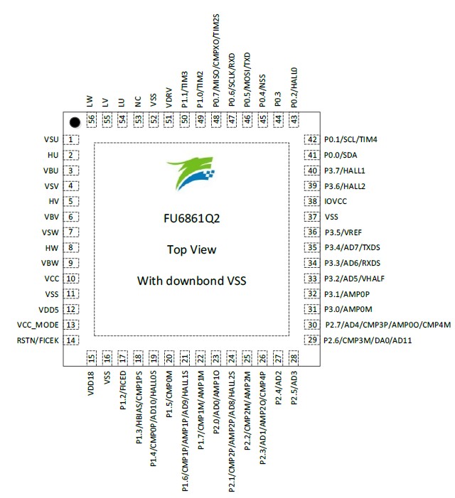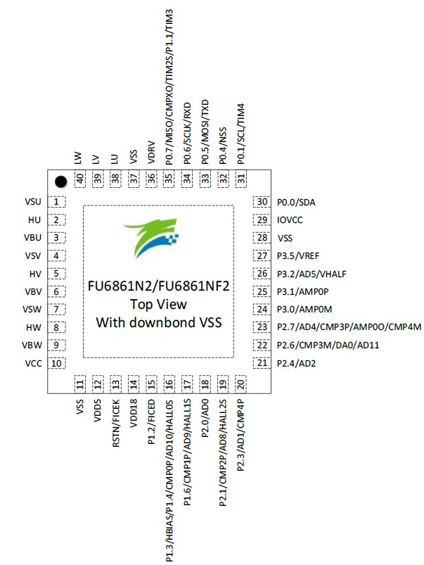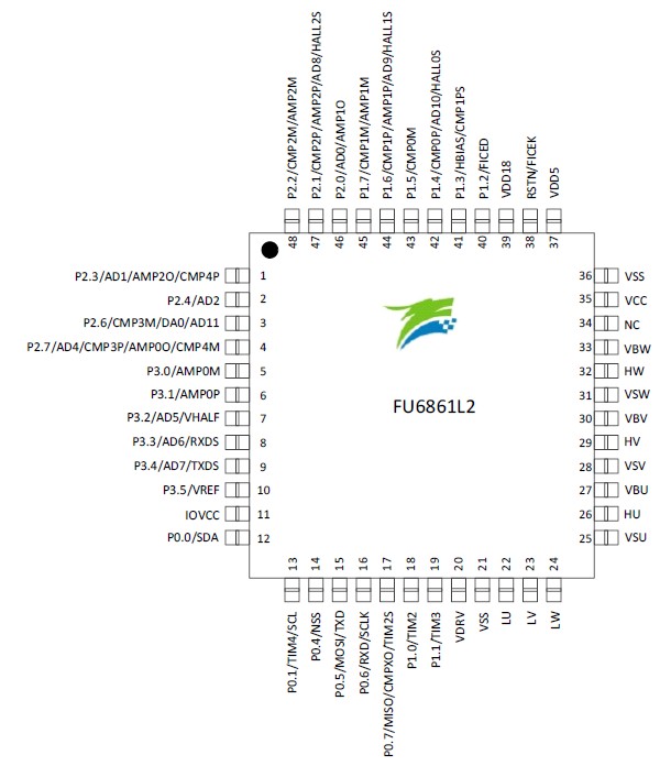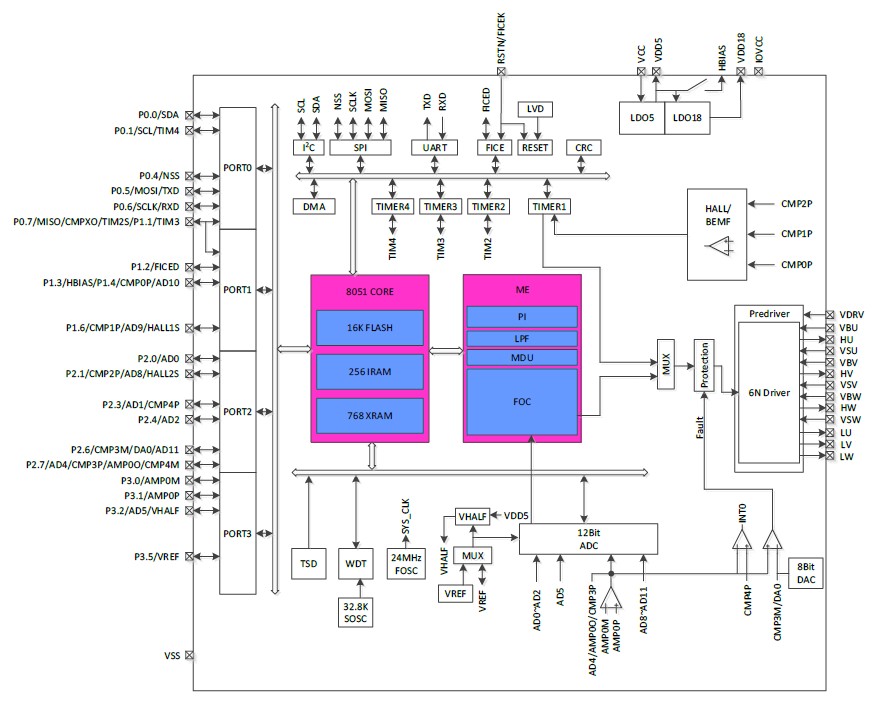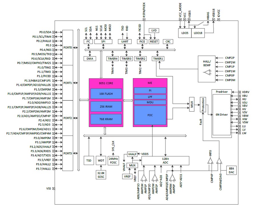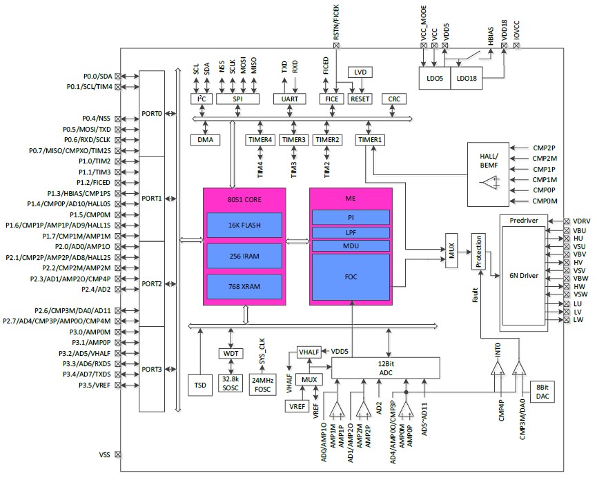 The high-performance motor drive chip incorporates MotionEngine ME core and 8051 core. ME core integrates FOC, MDU, LPF, PID and SVPWM modules that allow for automatic calculation of FOC or square-wave control by the hardware for sensored/sensorless BLDC/PMSM motors. 8051 core is used for parameter configuration and routine processing. Most of 8051 core instruction cycle takes 1T or 2T clock cycle(s).