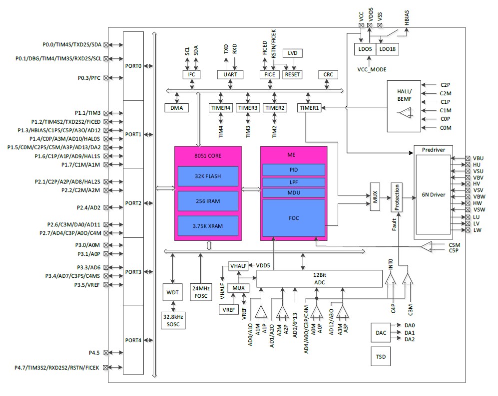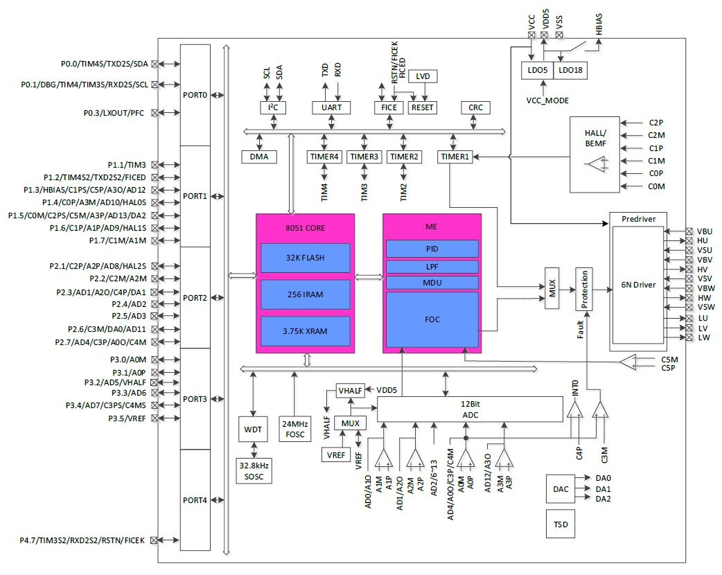 The high-performance motor drive chip incorporates MotionEngine ME core and 8051 core an 32k FLASH.