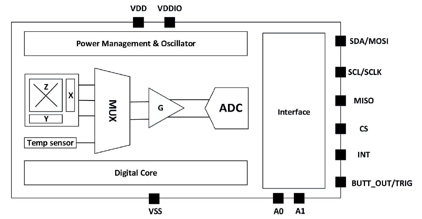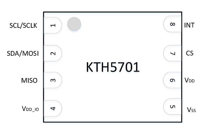 The KTH5701 is a digital output 3D Hall sensor chip that integrates three independent Hall sensors for the X, Y, and Z axes. The signal chain uses a high precision operational amplifier and a 16-bit ADC to convert the analog signals into digital outputs. The external host can read the measurement data through SPI or I2C modes. Additionally, the chip integrates a temperature sensor for magnetic field temperature compensation.