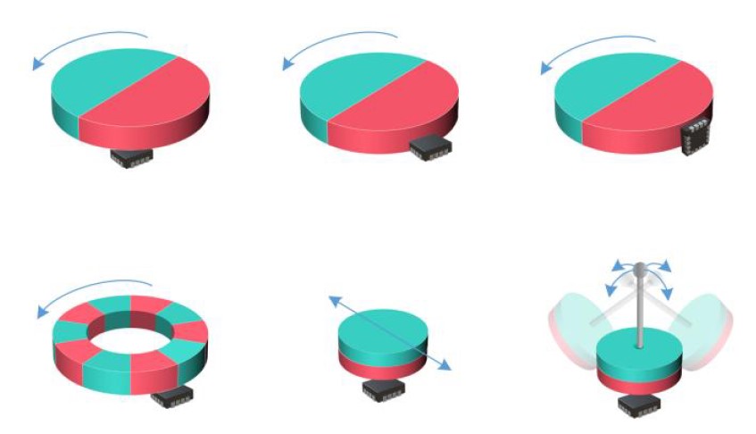 The KTH5701 also integrates the CORDIC algorithm to support plane angle output (XY plane, XZ plane, YZ plane). The amplitude adjustment register greatly facilitates common knob applications in both on-axis and off-axis configurations. It supports magnetic field threshold detection for the selected plane (XY plane, XZ plane, YZ plane), allowing the same chip to detect both knob and button scenarios simultaneously. This product features high integration and flexible application, making it widely applicable in various scenarios.