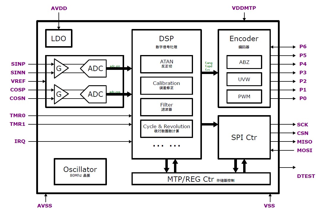 KTM5800 is a versatile angle subdivision chip. It includes several functional modules, such as an 30-bit absolute value divider, a 12-bit (4096 pole pairs) multi-pole pair counter, and an optimized filter, which can be configured through registers for the desired encoder resolution. This SoC offers a wide range of output options, including ABZ/UVW/PWM/SPI interfaces. In most applications, KTM5800 can directly receive differential sine/cosine input signals ranging from 20mV to 2V without external signal conditioning. These input signals can come from magnetic or optical sensors. The system is equipped with automatic calibration and adaptive functions to correct sensor offset, sine/cosine amplitude matching, and phase orthogonality, ensuring minimal angle error and jitter. Additionally, the KTM5800 SoC features an industry leading 2MHz 16-bit SAR ADC to enhance performance and precision. A significant advantage of KTM5800 is its ability to automatically detect and correct non-linear errors during normal operation, with just a button press or an SPI command. Furthermore, KTM5800 integrates a 256-point error lookup table, allowing customers to improve absolute accuracy by writing nonlinear error corrections from optical encoders into KTM5800. When connected to AMR/TMR sensors and a single-pole magnet combination, both one-button self-calibration and the 256-point error lookup table can achieve INL≤0.025°.