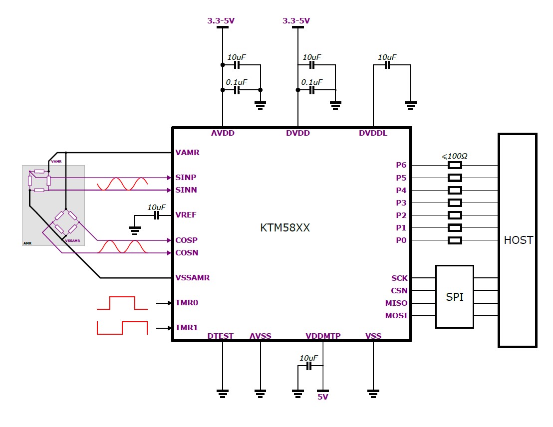 Additional features of KTM5800 include automatic linear and non-linear calibration, Z signal calibration, absolute position synchronization for multi-pole applications, automatic AMR matching for orthogonal signal calculation, and programmable operational amplifier gain. KTM5800 has made some optimizations to its functional safety, such as the SPI angle output communication with an 8-bit CRC verification and the integration of many self diagnostic alarm functions, such as AMR Input Sine/Cosine Amplitude Anomaly,Input Undervoltage Detection,Excessive Filter Lag,etc.
