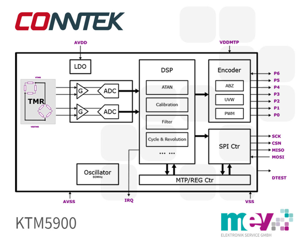 KTM5900 is an 24-bit absolute angle encoder with 4096 pole pairs subdivision. It works with magneto-resistive sensors (TMR) to create a precise non-contact magnetic encoder. It reads sine and cosine signals from the sensor rapidly, enabling angle calculation through its high-speed digital circuit.