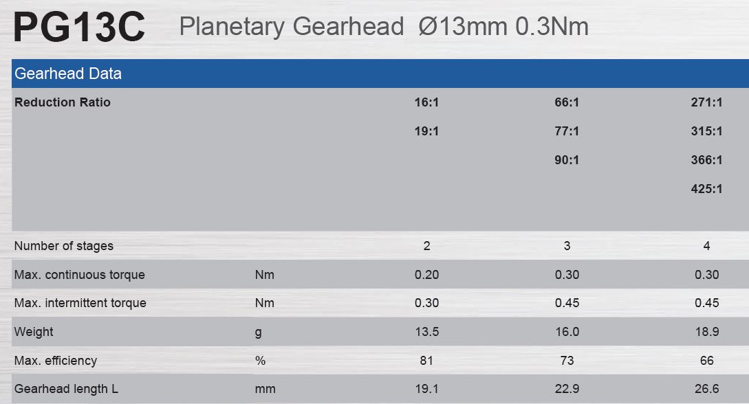 MOONS’ Planetary Gearhead Family for 13mm high performance slotless BLDC motors. Available only in combination with ECU13026 [&] ECU13038 Series Motors.