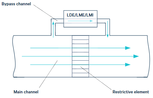 A restrictive element in the main channel defines the relationship between gas flow F and differential pressure (∆P):