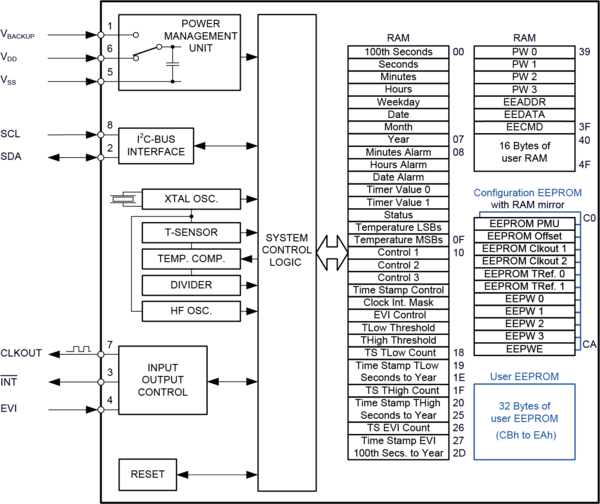 Beside standard Real-Time Clock (RTC) functions like Calendar (100th of second through (leap-) year), Timer & Alarm, it includes an accurate high-resolution Temperature Sensor with programmable temperature window detection interrupt, smart power management functions and User EEPROM & RAM. External event detection interrupt with time stamp combined with programmable password, offers security solutions against fraud and hacking.