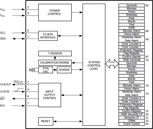 Standard Clock & Calendar function tracks second, minute, hour in 24-hour format, year and leap -year flags. Beside standard RTC function like Timer & Alarm, it includes integrated Temperature Sensor, Time Stamp Event Input and User RAM and offers I²C-bus (2-wire Interface).