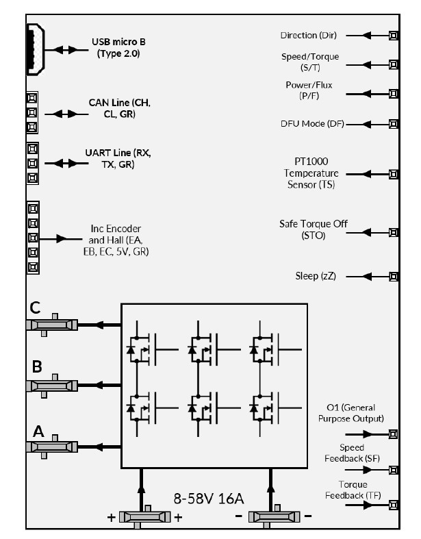 SOLO MEGA is a member of the SOLO motor controllers family of devices capable of driving and controlling various types of electrical motors like DC brushed, BLDC, PMSM and EC coreless motors in a single latform.They are made to be easy to use with state of art technologies and Dual Core parallel processing architecture on top of FOC control methods.