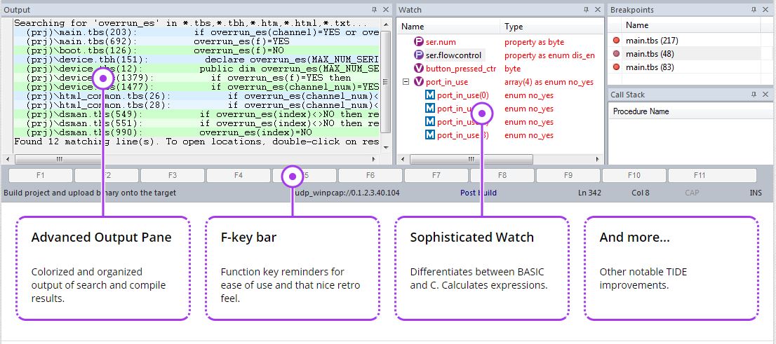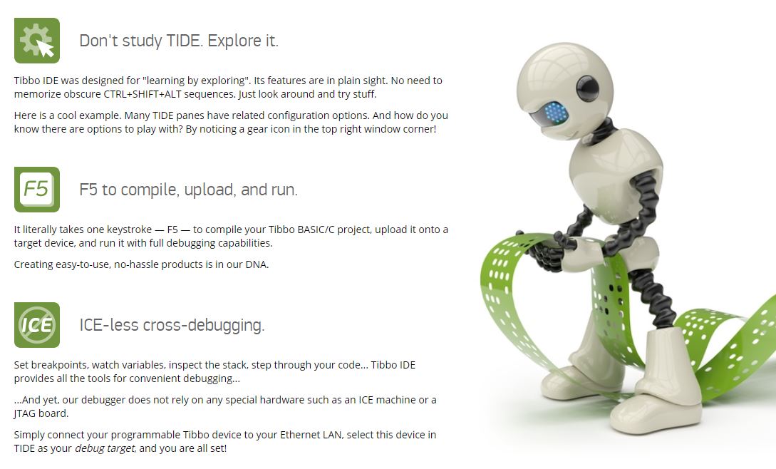 Other editors may keep gaining weight and visual clutter with every release, but our Tibbo IDE (TIDE) software for Windows stays light, agile, and pleasing to the eye — all while packing a ton of features. Good things don’t need a gig of drive space, folks. Enjoy the right kind of lean!