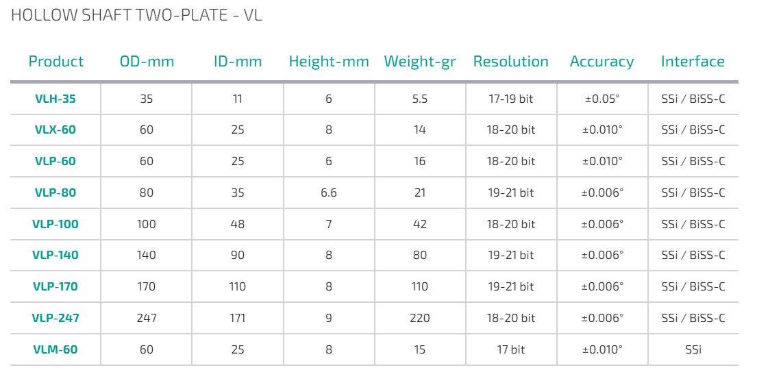 | VLP-170 | 170 | 110 | 8 | 110 | 19 … 21 | ± 0,006° | SSi / BiSS-C | 1500 | Single turn, Mil-std-810 |