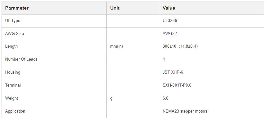 Cable for ML23HS Series 57mm/NEMA23 Bipolar Hybrid Stepper Motors with JST connector.