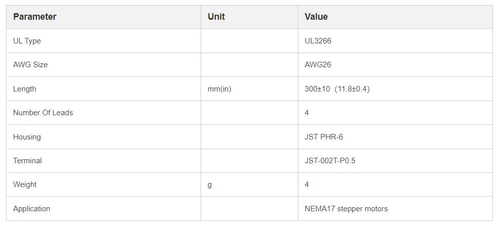 Cable for MS17HD Series 42mm/NEMA14 Bipolar Hybrid Stepper Motors with JST connector.