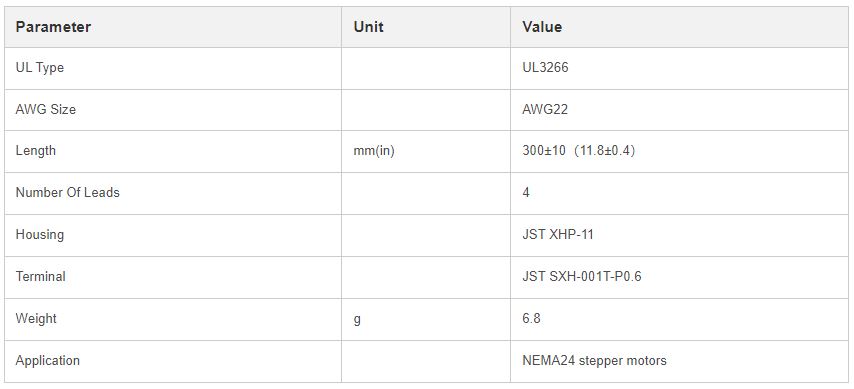 Cable for MS24HS Series 60mm/NEMA24 Bipolar Hybrid Stepper Motors with JST connector.