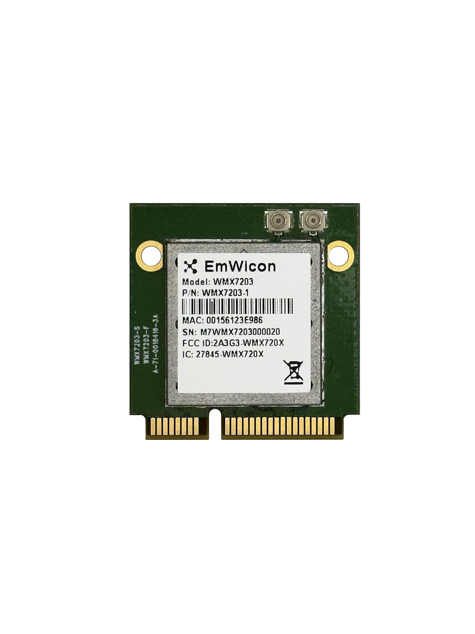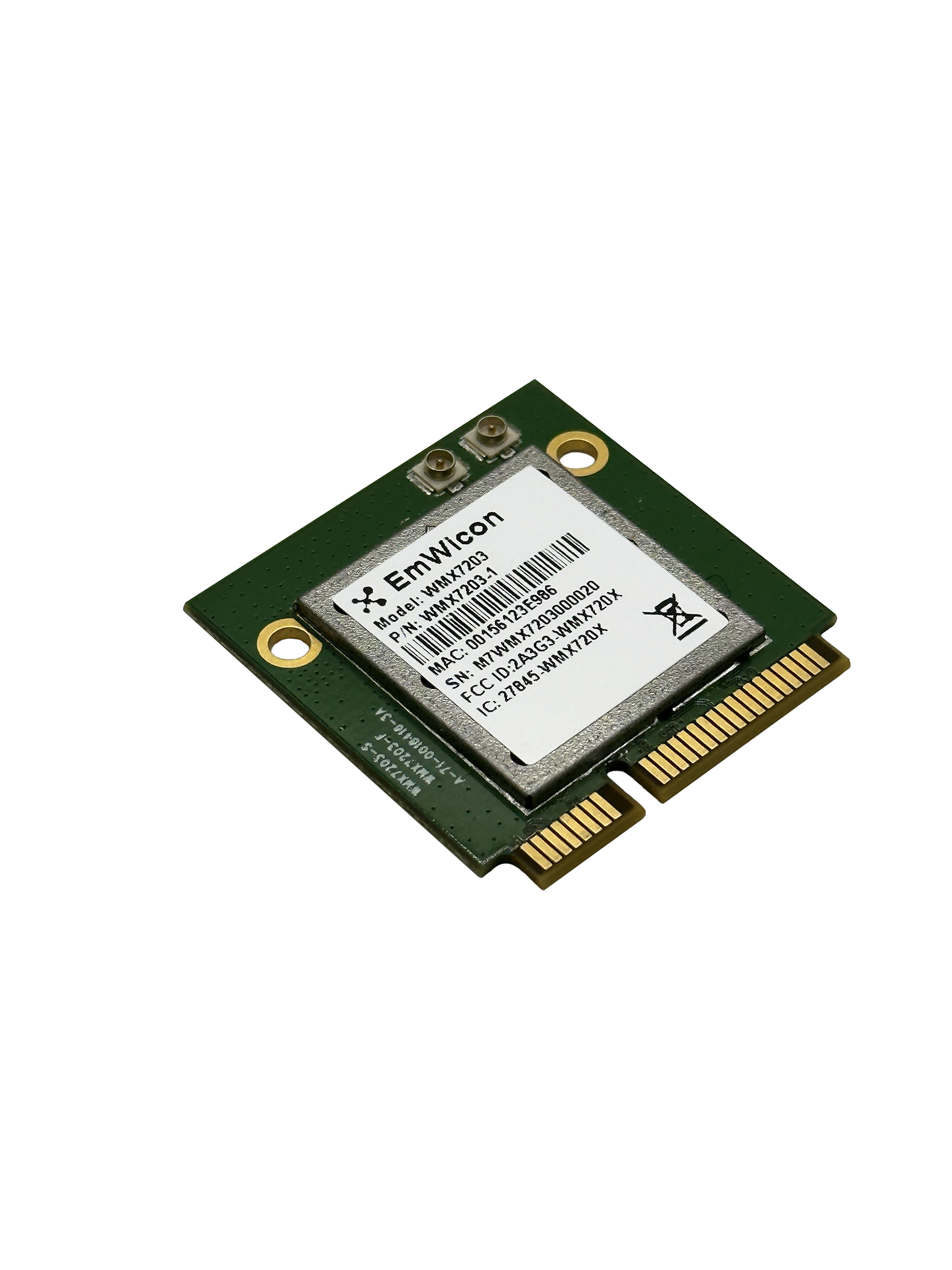 The Emwicon WMX7203 module is a highly integrated wireless local aera network (WLAN) Mini PCIe module. The module based on Qualcomm WCN6856/QCA2066 an that is supporting 802.11ax Wi.Fi and Bluetooth (BT).